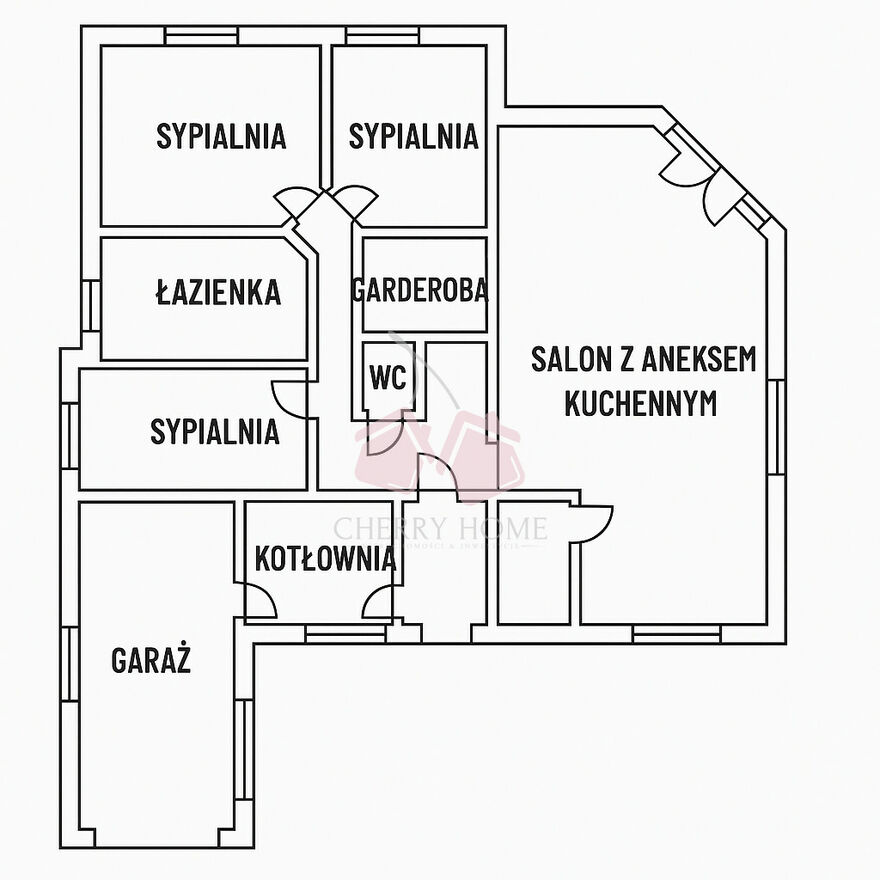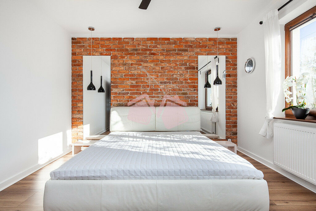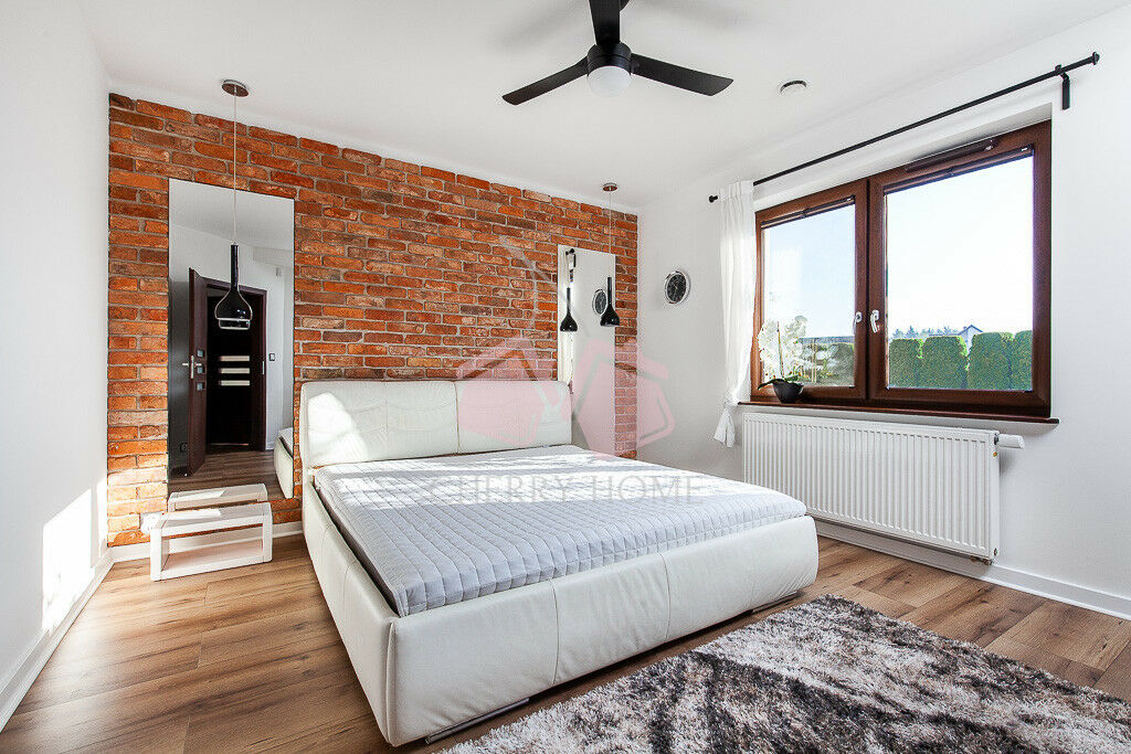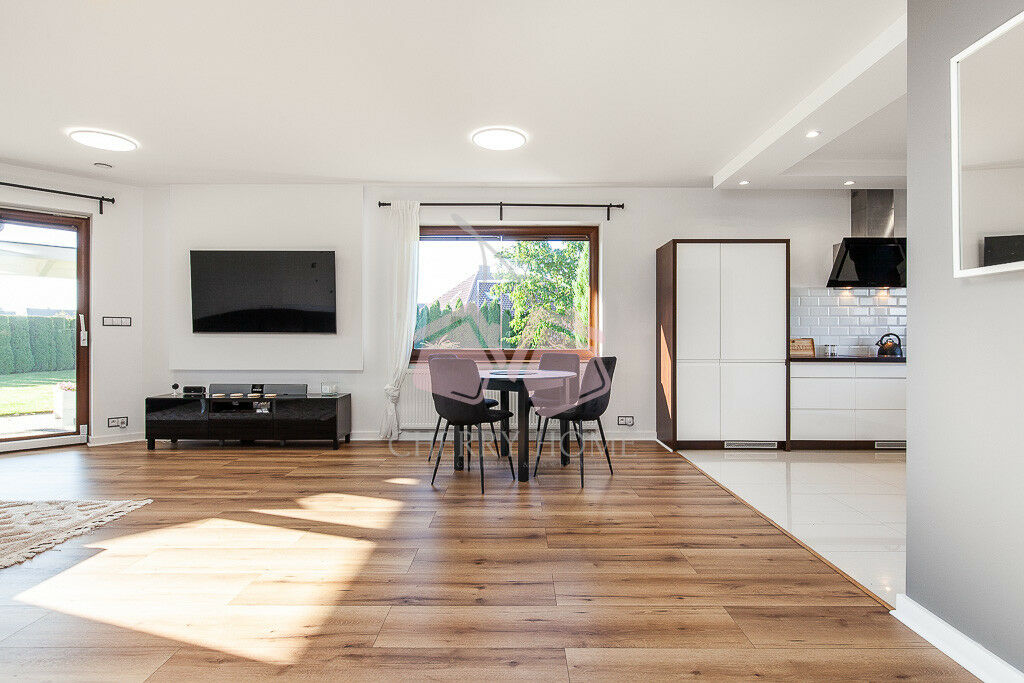 Pomieszczenia: 4 pokoje (w tym 3 sypialnie), 2 łazienki, aneks kuchenny, spiżarnia, garderoba, kotłownia, garaż